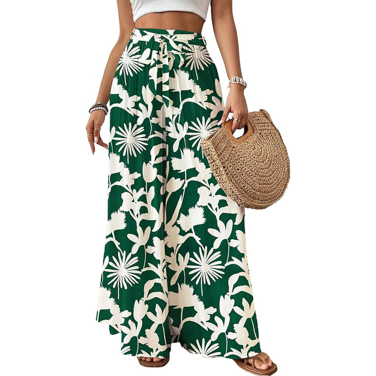 Stay effortlessly chic and comfortable with these floral high-waisted palazzo pants. Made from soft, breathable fabric, they feature a flattering wide-leg silhouette, an adjustable waist belt, and elegant leafy prints—perfect for beach days, casual strolls, or even dressed-up occasions.