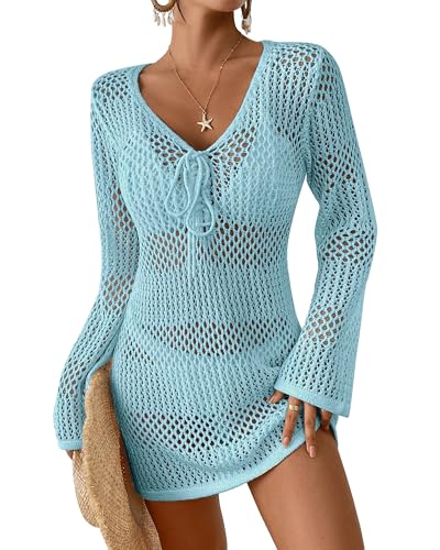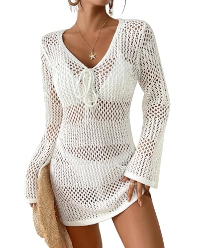 Women's Crochet Swimsuit Cover Up - Long Sleeve V Neck Hollow Out Knit Beach Dress, made of 55% Acrylic & 45% Polyamide. Comfortable, breathable, perfect for beach, pool, water park & honeymoon. Adjustable bust drawstring, plus size friendly.